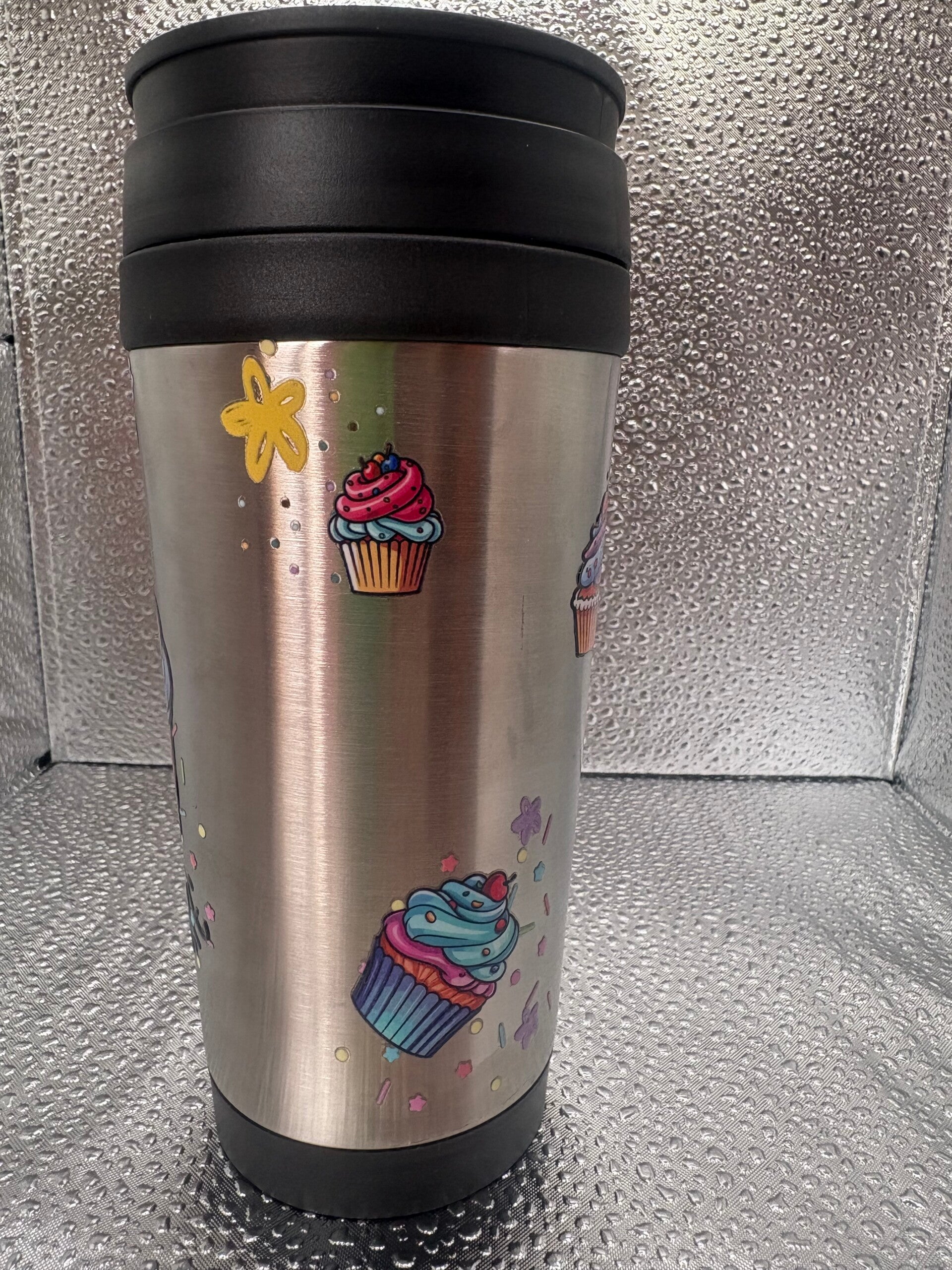 Turn up the sass and keep your drink perfectly hot (or icy cold) with this silver thermal cup featuring cute cupcakes and a not-so-cute reminder.