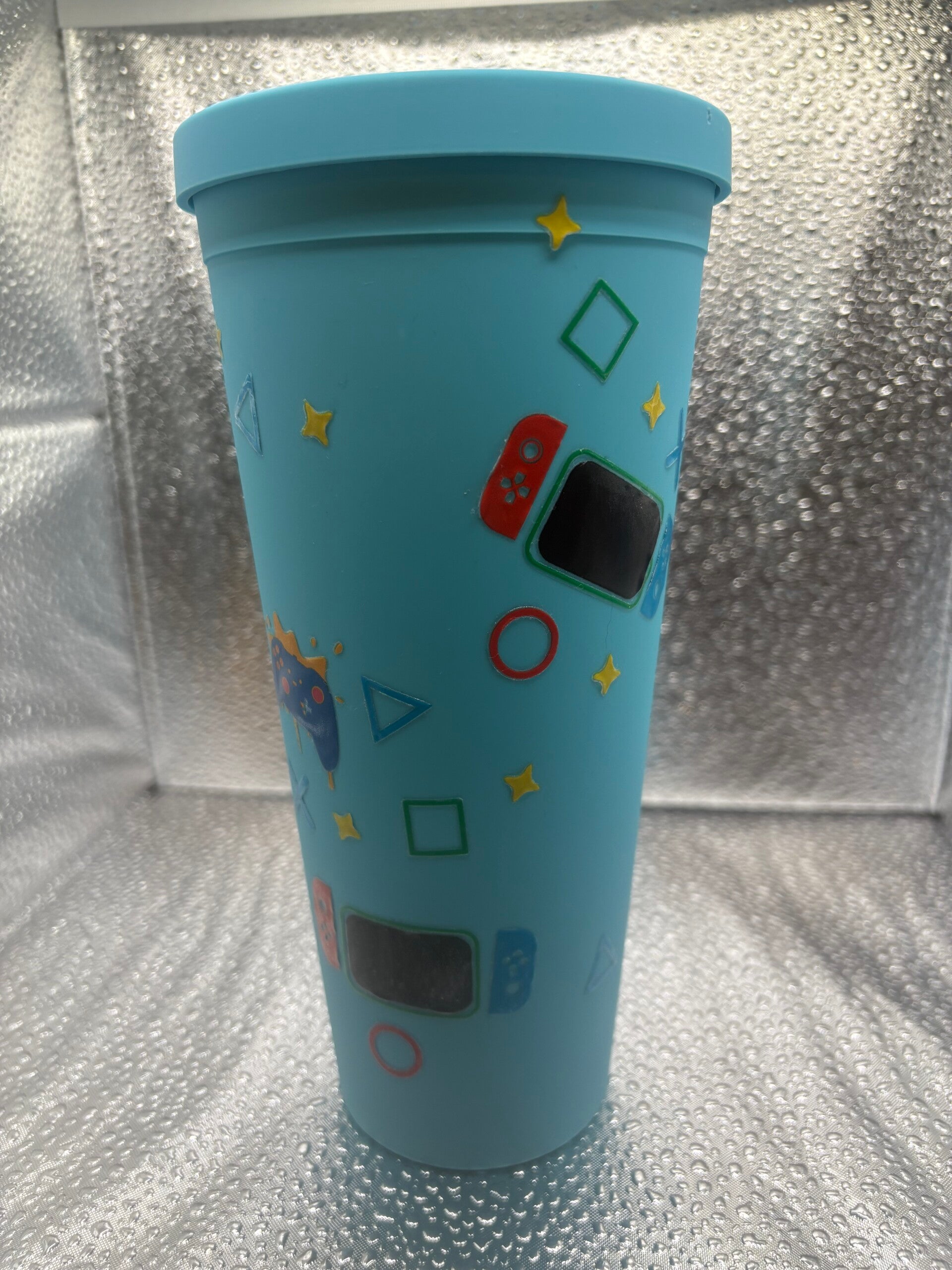 Level up your sip game with this vibrant blue double-walled tumbler! Featuring fun gaming-inspired images, it’s perfect for coffee, energy drinks, or any beverage that fuels your next high score.